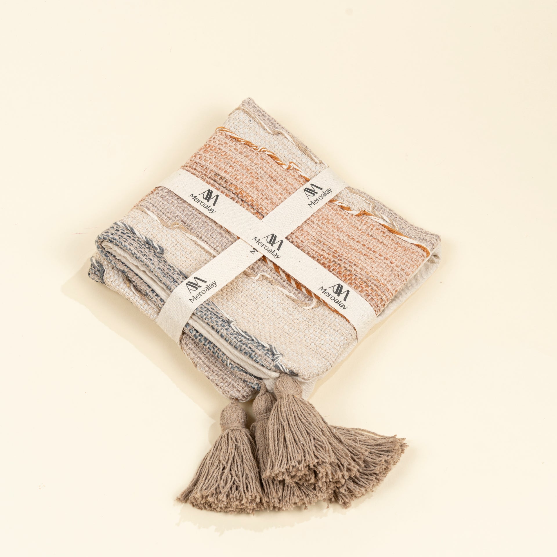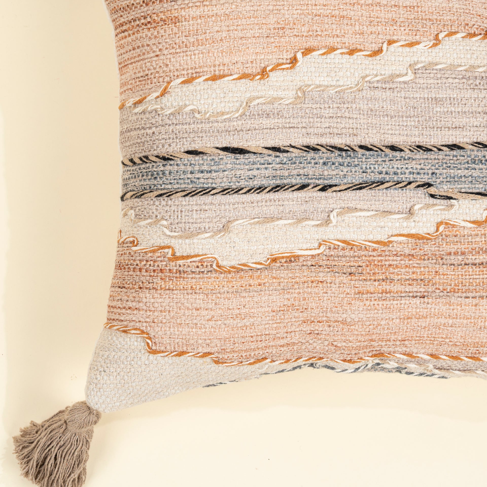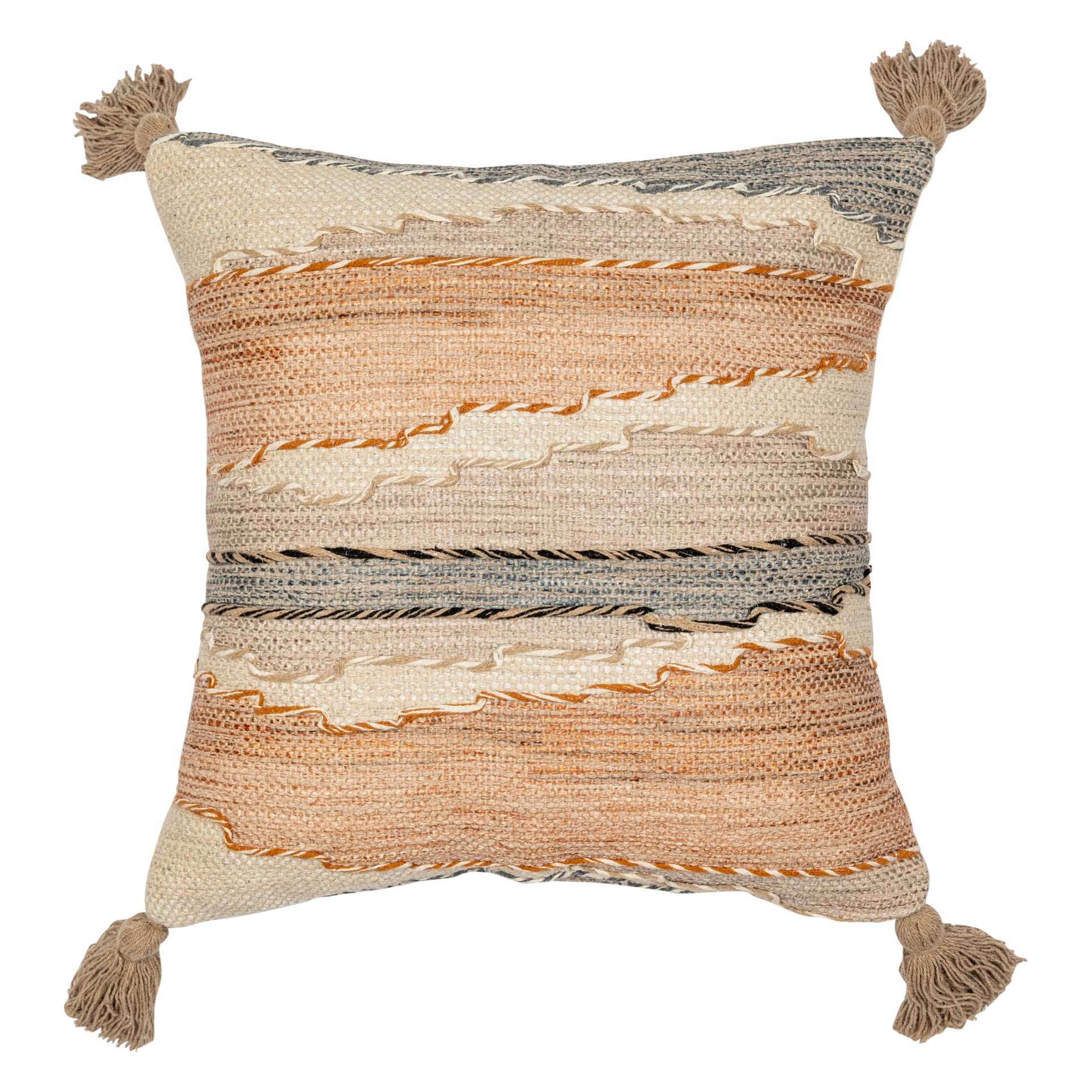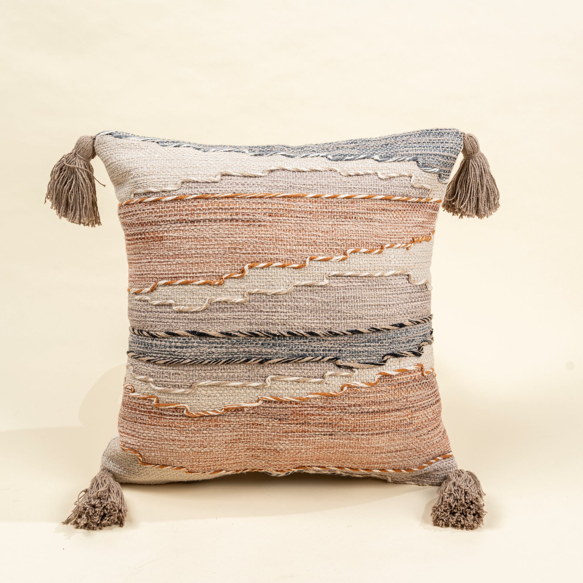 Ever wanted that extra touch of cozy charm? This woven cushion cover, in delightful shades of grey and orange, is like a warm hug for your sofa. Its got tassels at the corners that swing with a little sass. And the woven pattern? Its like a sunset on fabricwarm and inviting. Need to freshen it up? Just toss it in the machine. Perfect for those lazy Sundays with a book and a cup of coffee. Dont you just love a piece that makes your space feel like home?1. The product includes one cushion cover.2. The product comes in two sizes (18x18 inches) Size Includes Measurement 18x18 inch 1 Cushion Cover 18 x 18 inches || 45 x 45 cms